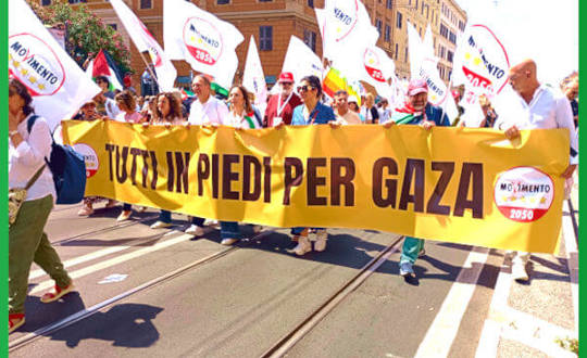Tante, forse troppe, le bandiere dei partiti che hanno organizzato la manifestazione, PD 5Stelle e AVS, sotto la pressione dell'opinione pubblica stanca di non essere chiamata ad esprimere rabbia per le notizie tragiche che ogni giorno arrivano da Gaza e sostegno per i tentativi diplomatici a favore di un cessate il fuoco che consenta di inviare aiuti umanitari.