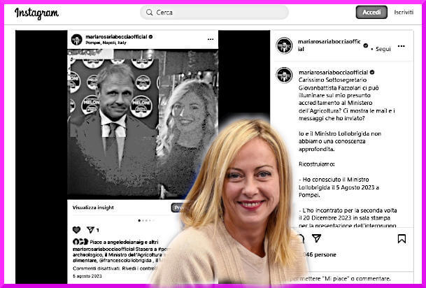Dopo aver costretto alle dimissioni il bersaglio più facile, il facilone ministro della Cultura Gennaro Sangiuliano, Maria Rosaria Boccia ha iniziato a puntare la Meloni Arianna, sorella e braccio destro di Giorgia Meloni, nonché compagna fino a qualche settimana fa, prima di mollarlo per una improvvisa crisi sentimentale, del ministro dell'Agricoltura Francesco Lollobrigida, e l'Agricoltura in Italia come tutti sanno conta molto più della Cultura.