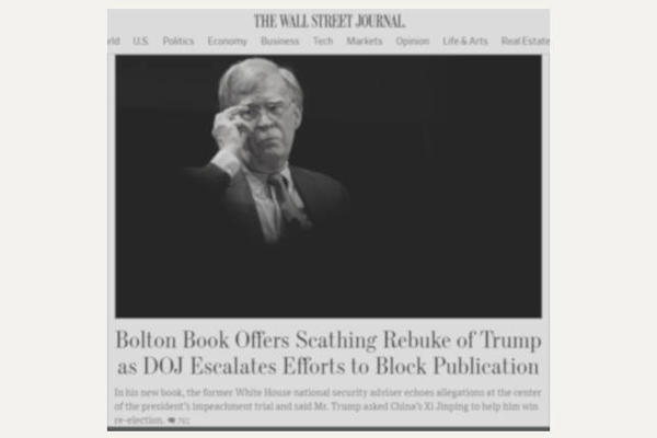 Il libro di Bolton "THE ROOM WHERE IT HAPPENED" edito da Simon & Schuster dovrebbe essere in vendita dal 23 giugno. Donald Trump ha mobilitato tutti i suoi maggiordomi, in particolare il ministro della giustizia (?) William Barr e il suo braccio destro Rudolph Giuliani, nel tentativo di bloccarne l'uscita e di incriminare John Bolton per chiederne l'arresto.