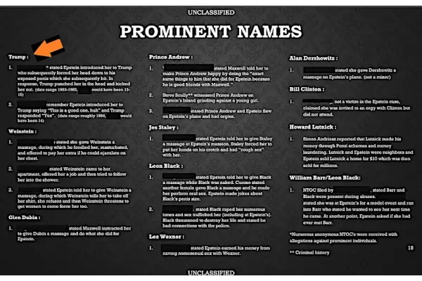 ... Una versione del PowerPoint fu inviata al direttore dell'FBI Kash Patel il 7 agosto 2025, un mese prima che dichiarasse al Congresso che l'agenzia non aveva prove per perseguire altri uomini in relazione ai crimini di Epstein. L'udienza divenne tesa quando i rappresentanti insistettero su questo punto. "A chi, se c'era qualcuno, Epstein ha venduto queste giovani donne oltre a se stesso?" ha detto il senatore repubblicano della Louisiana John Neely Kennedy. "Lui stesso. Non ci sono informazioni attendibili. Nessuna. Se ci fossero, avrei portato il caso ieri, sostenendo che ha trafficato con altri individui", ha detto Patel. "Le informazioni che abbiamo, ancora una volta, sono limitate." Secondo le e-mail e i documenti rilasciati dal Dipartimento di Giustizia come parte dei fascicoli Epstein, le accuse contenute nella presentazione includono stupro, partecipazione a orge e riciclaggio di denaro. La presentazione PowerPoint presenta alcuni parallelismi con un altro documento, anch'esso non reso pubblico in precedenza: un promemoria dell'accusa di 86 pagine inviato al procuratore statunitense Geoffrey S. Berman il 19 dicembre 2019, intitolato "Indagine sui potenziali cospiratori di Jeffrey Epstein". La nota dell'accusa è stata pubblicata anche insieme ai documenti del Dipartimento di Giustizia, ma sembra che nel frattempo sia stata rimossa dal sito web dell'agenzia. Gli avvocati degli uomini accusati nei fascicoli, o gli uomini stessi, hanno negato le accuse contenute nei fascicoli, il che li ha posti sotto l'occhio vigile del pubblico. Cinque di loro non sono stati contattati per un commento, ma hanno precedentemente negato qualsiasi illecito. Non è chiaro in che misura l'FBI abbia indagato su ciascuno di loro.