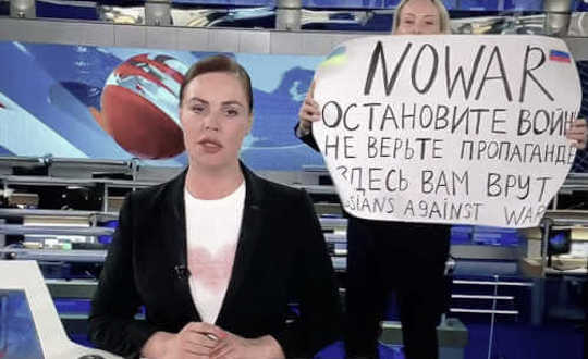 La donna coraggiosa è Marina Ovsyannikova, giornalista della TV Canale1 e sul poster, sotto NOWAR c'è una scritta in russo "Ferma la guerra. Non credete alla propaganda. Qui ti stanno mentendo" E poi, in inglese "Russians against the war".