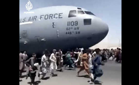 Giù in basso altre migliaia di afghani iniziano a rincorrere gli aerei dei paesi occidentali, in un'assurda e straziante gara di velocità.