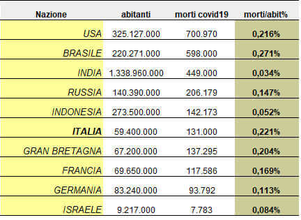 L'indice di mortalità generato dai 700mila morti negli Stati Uniti è pari a 0,216; l'indice di mortalità Covid in Italia, 131mila morti, è 0,221.