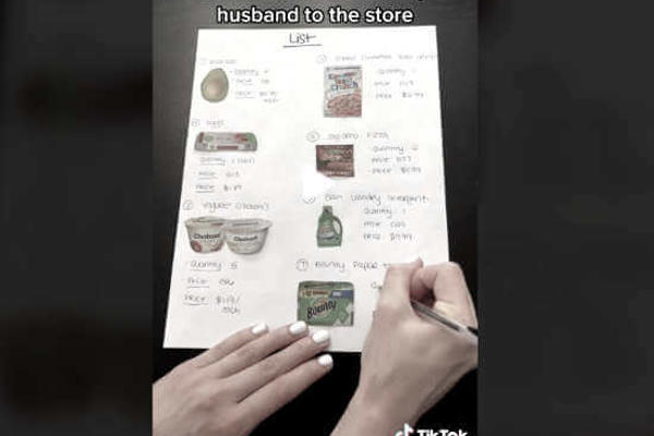 Tranne che questa lista non era per un bambino. È stato pubblicato da una donna sulla piattaforma di social media TikTok con il testo sullo schermo, "Quando devo mandare mio marito al negozio".