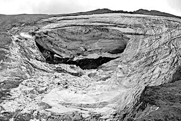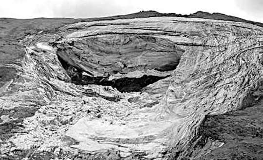 Quello che resta del Ghiacciaio della Marmolada crollato su una trentina di innocenti escursionisti uccidendone più della metà rassomiglia alla maschera di un dio arrabbiato, incattivito, deluso.