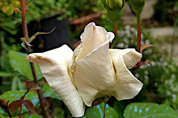 Ecco il primo bocciolo della sopravvissuta rosa bianca nel mezzo di un maggio 2023 che sembra novembre.